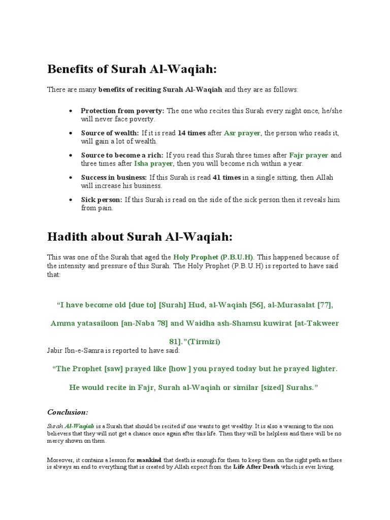 “surah al waqiah is the surah of wealth, so recite it and teach it to your children” [ibn asakir] prophet (saw) said that: The prophet muhammad (pbuh) said: